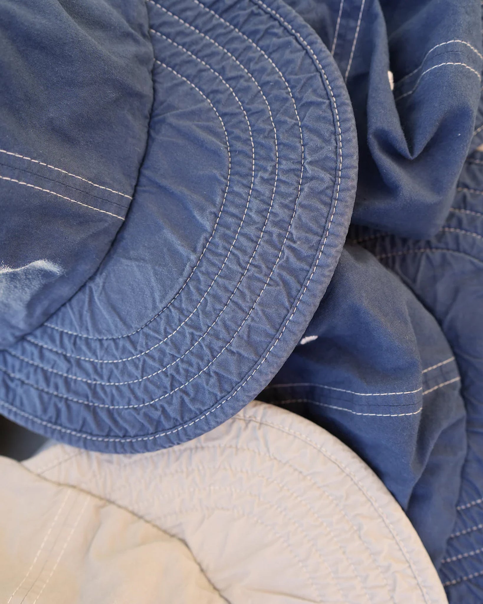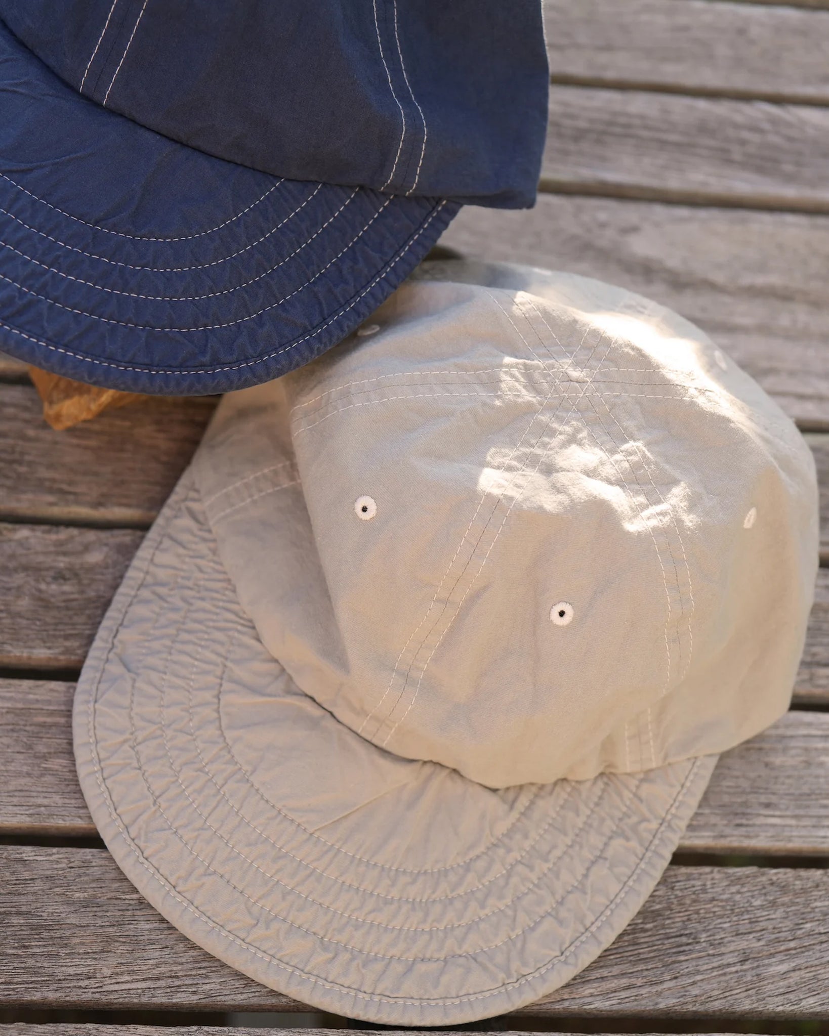 A 6 panel long brim cap constructed from a garment dyed Japanese cotton washi paper.  Due to the dying process ever item is unique.